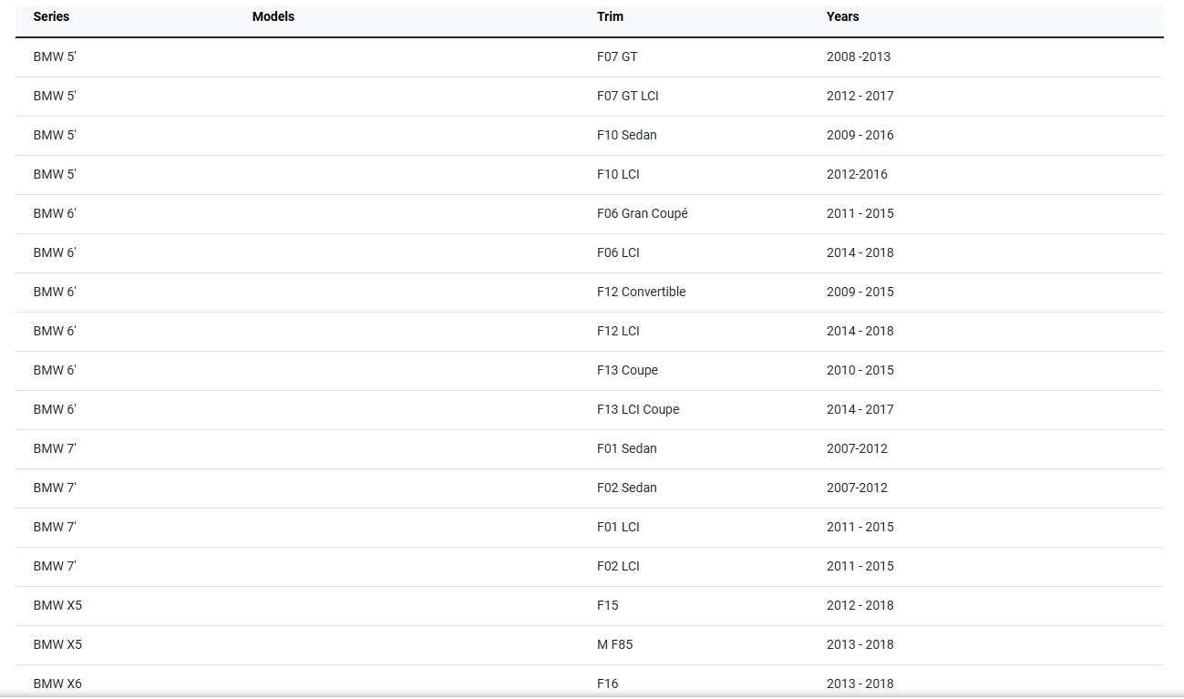 • 6' F13 Coupe (2011 - 2014): 640d. 640dX. 640i. 640iX. 650i. 650iX. M6 Coupe